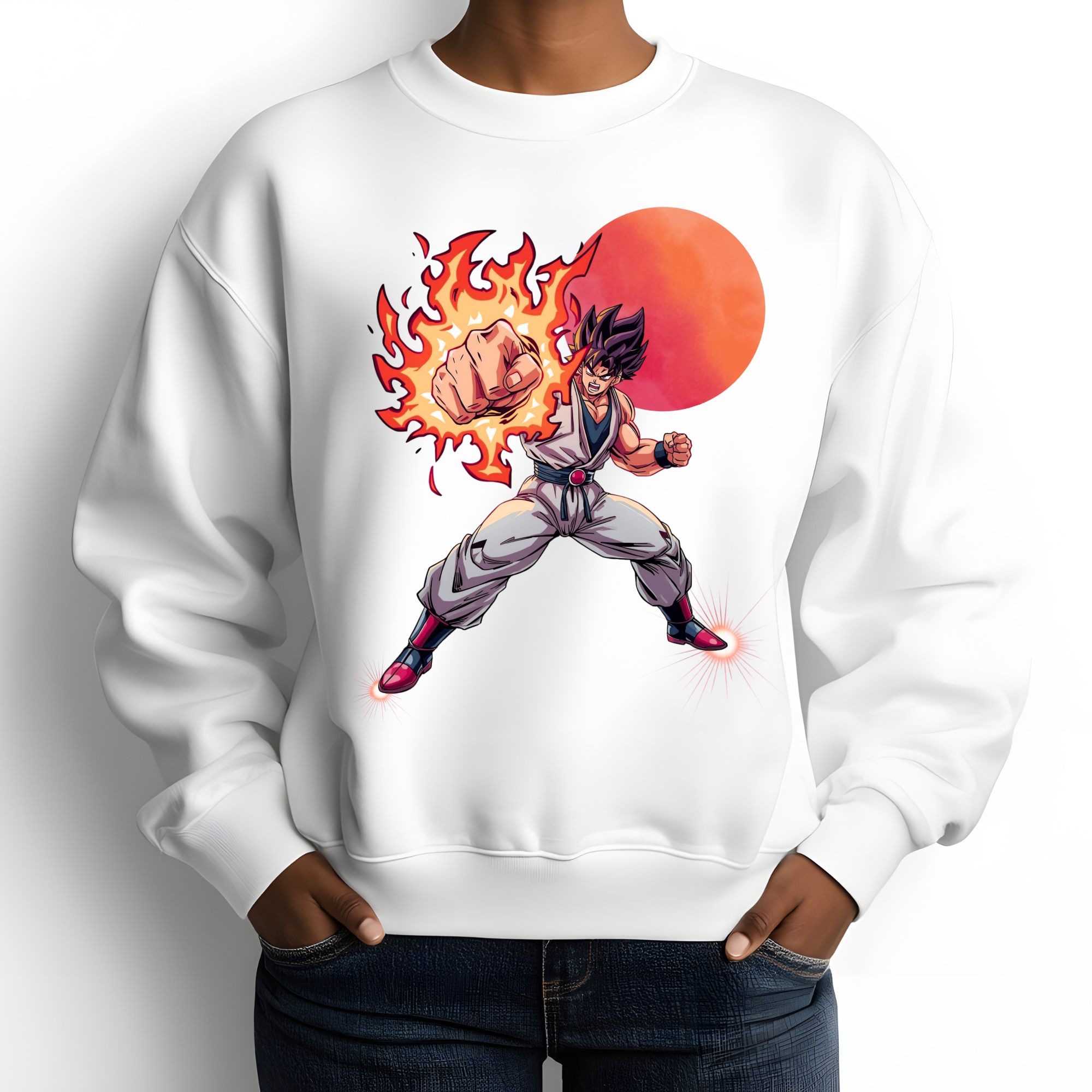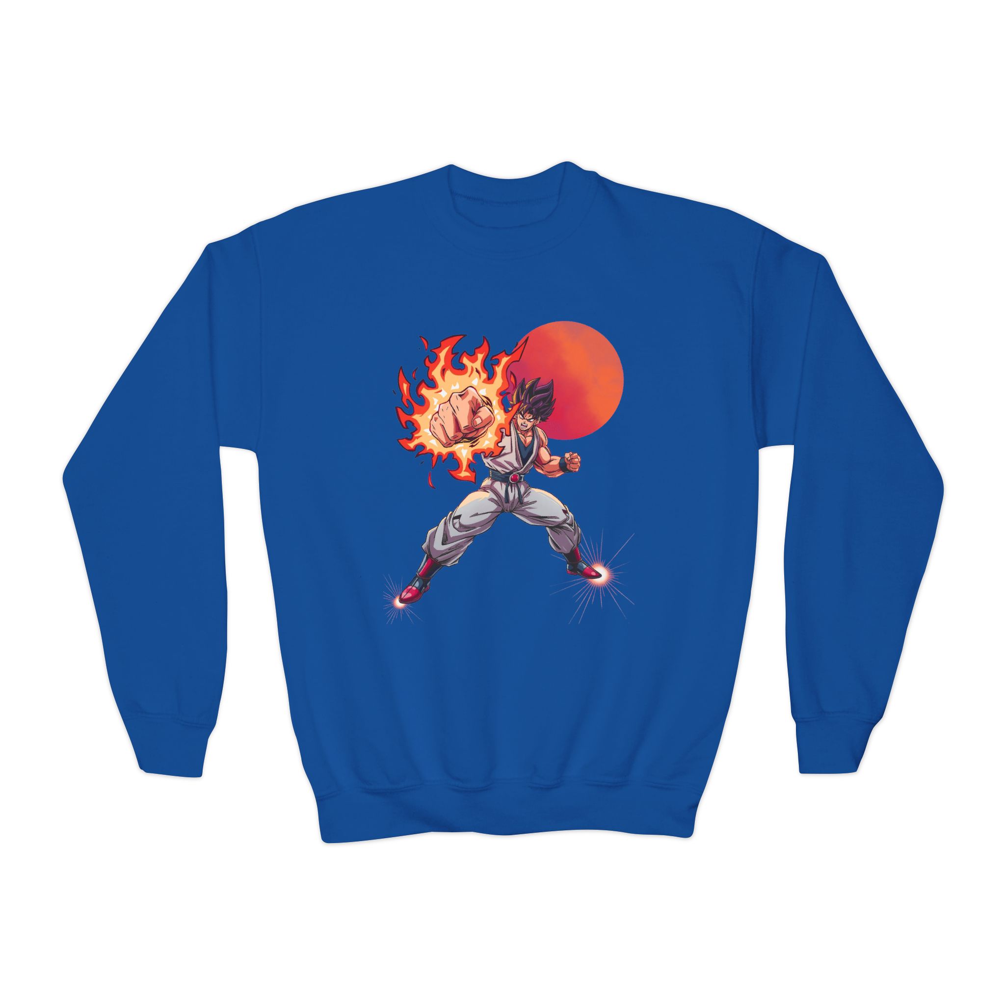 Street Fighting youth crewneck that brings animated energy to a child’s everyday play. The front showcases an embroidered-ready fighter launching a blazing orb against a warm rising sun, bold, playful colours that stand out on crisp white fabric. The medium-heavy knit feels soft but durable, holding its shape through roughhousing and repeated washes. Tubular construction eliminates side seams for a smoother silhouette and less waste, while ribbed collar and cuffs keep their stretch through endless movement. Sized for kids, with a tear-away label for comfort, this sweatshirt layers easily over tees or under jackets for school days, practice, or neighbourhood adventures.