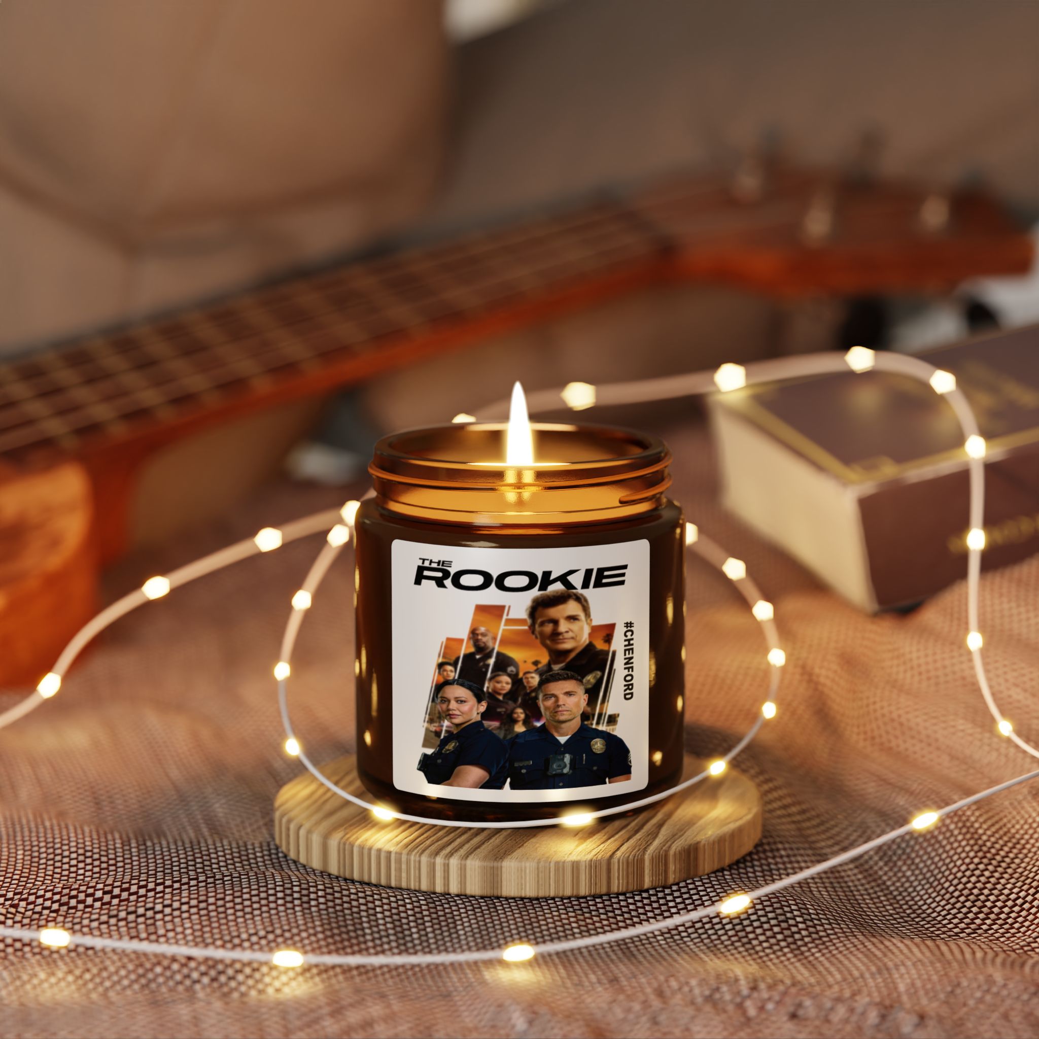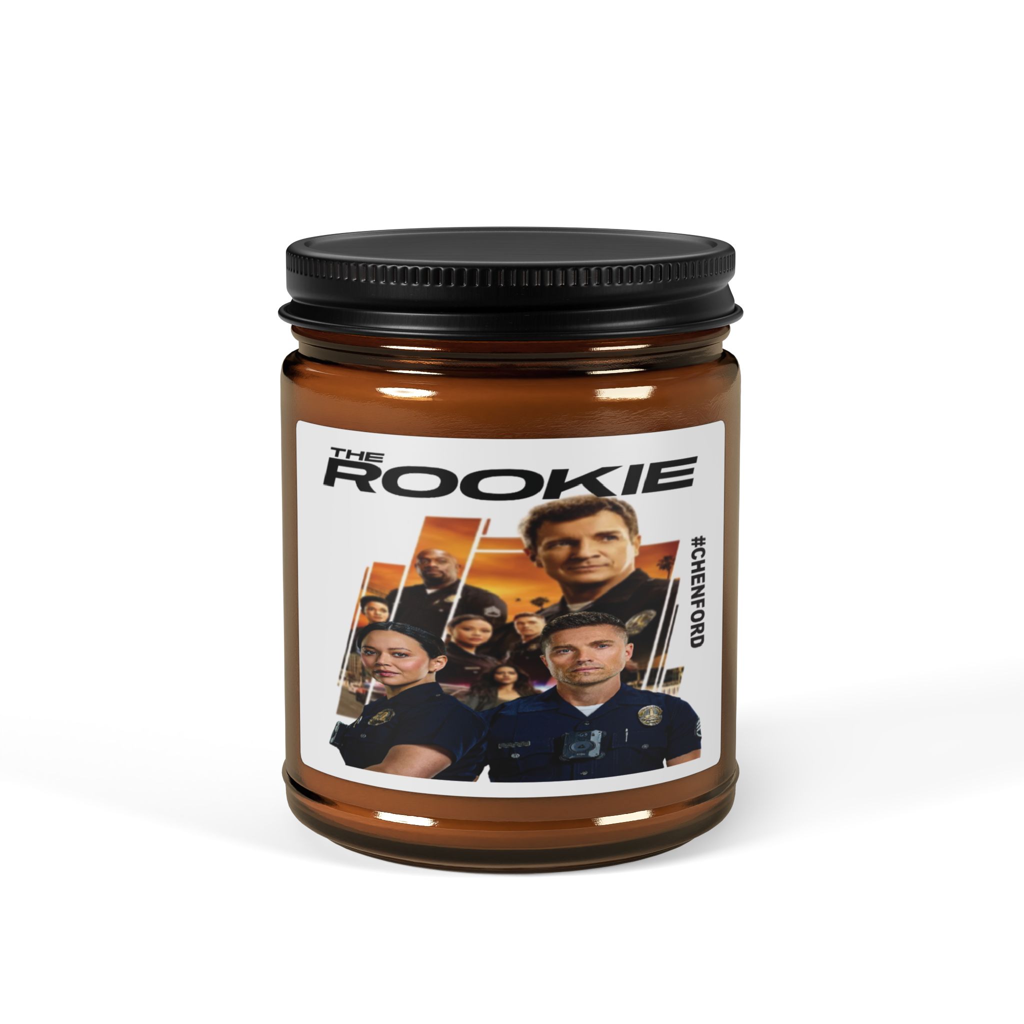 Chenford – The Rookie Inspired Poster Candle, an Amber glass candle that brings calm and character to everyday corners. Hand-poured from a 100% natural soy wax blend with a cotton wick, this jar burns clean and bright while filling the room with layered, thoughtfully crafted fragrances, from spicy cinnamon-vanilla swirls to a smoky orange-and-fir winter blend, to airy white sage and lavender. Relevant to those who appreciate eco-friendly products, enjoy relaxing scents, and love to create a cozy ambiance, perfect for holidays, celebrations, or everyday use.
