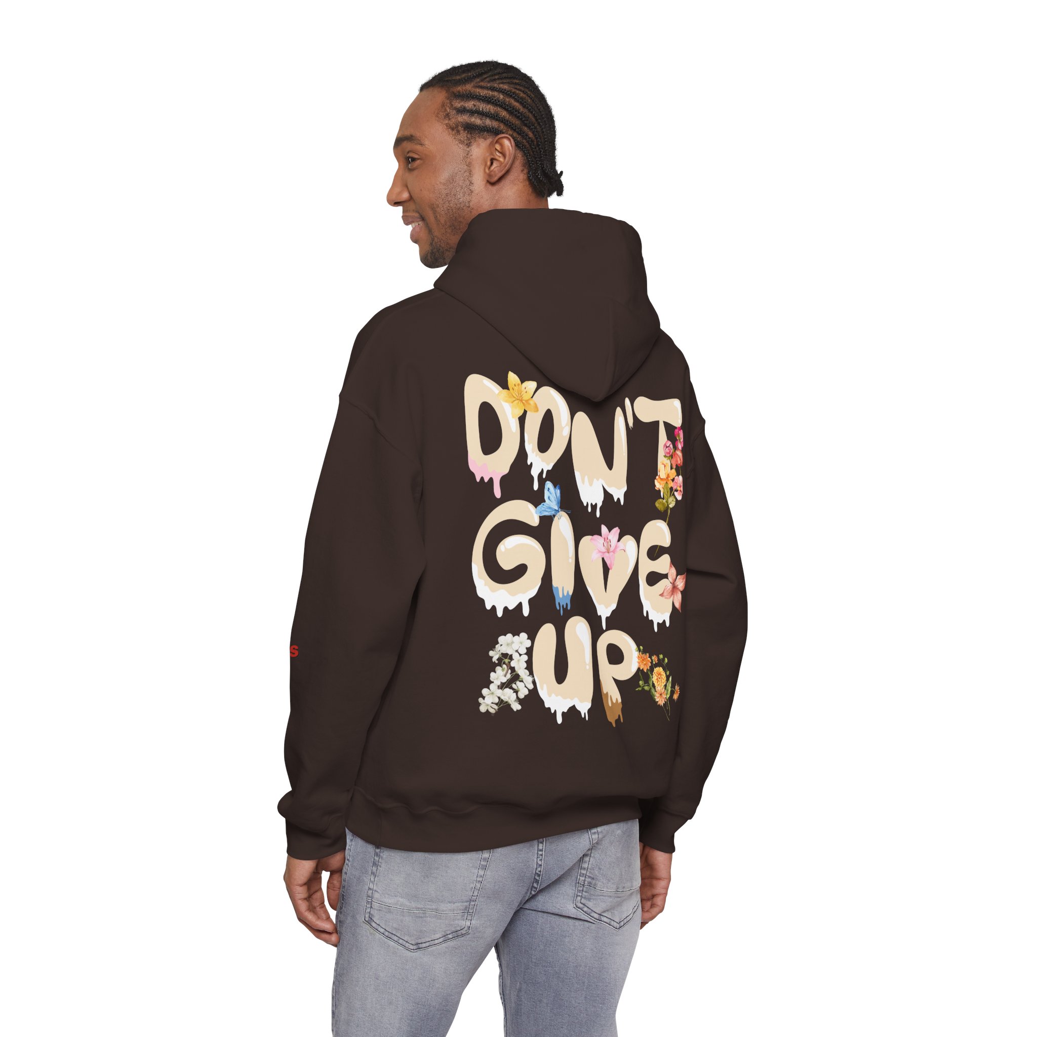 This hoodie is a quiet, wearable rally. The roomy pouch and double-lined hood create a small, trusted shelter on brisk mornings. Across the back, bold drippy letters spell DON’T GIVE UP, softened where delicate florals thread through each stroke, toughness meeting tenderness. A subtle “Wren Anders Brand” on the sleeve feels like a knowing signature, not a shout. Slip it on over a tee or under a coat when you need to steady your breath, settle your shoulders, and keep walking. It settles into everyday routines: coffee runs, late-night study sessions, slow walks, or those in-between moments when you need a reminder that a steady, gentle resolve matters.