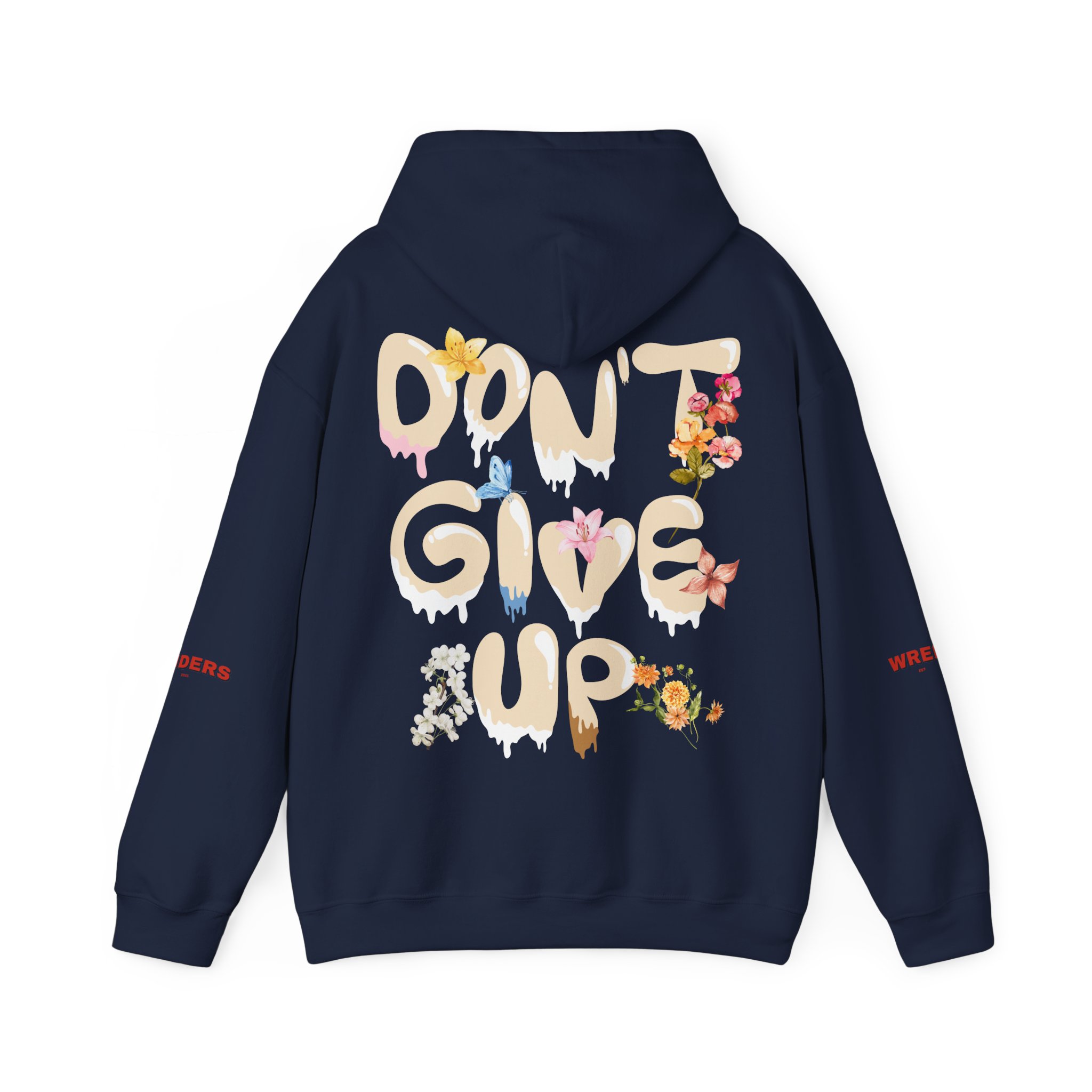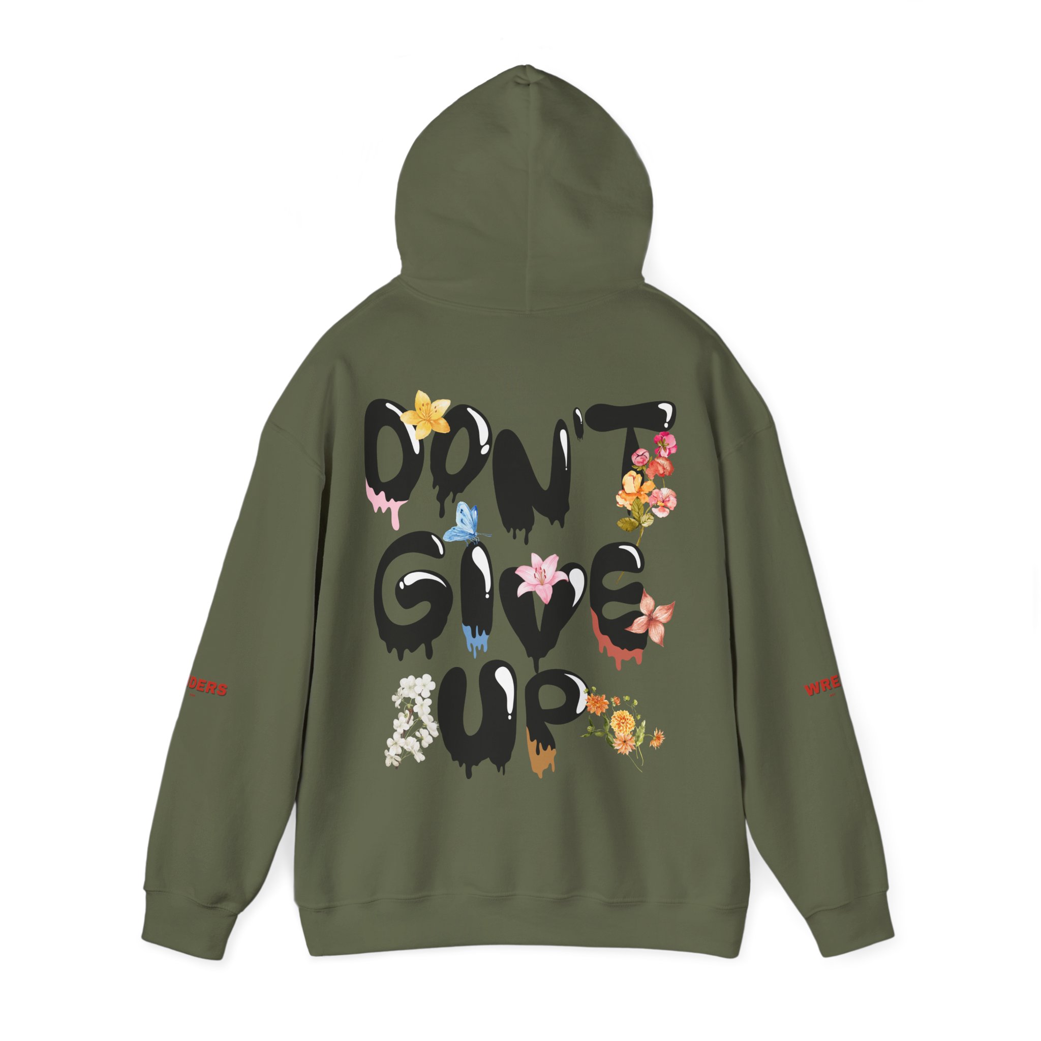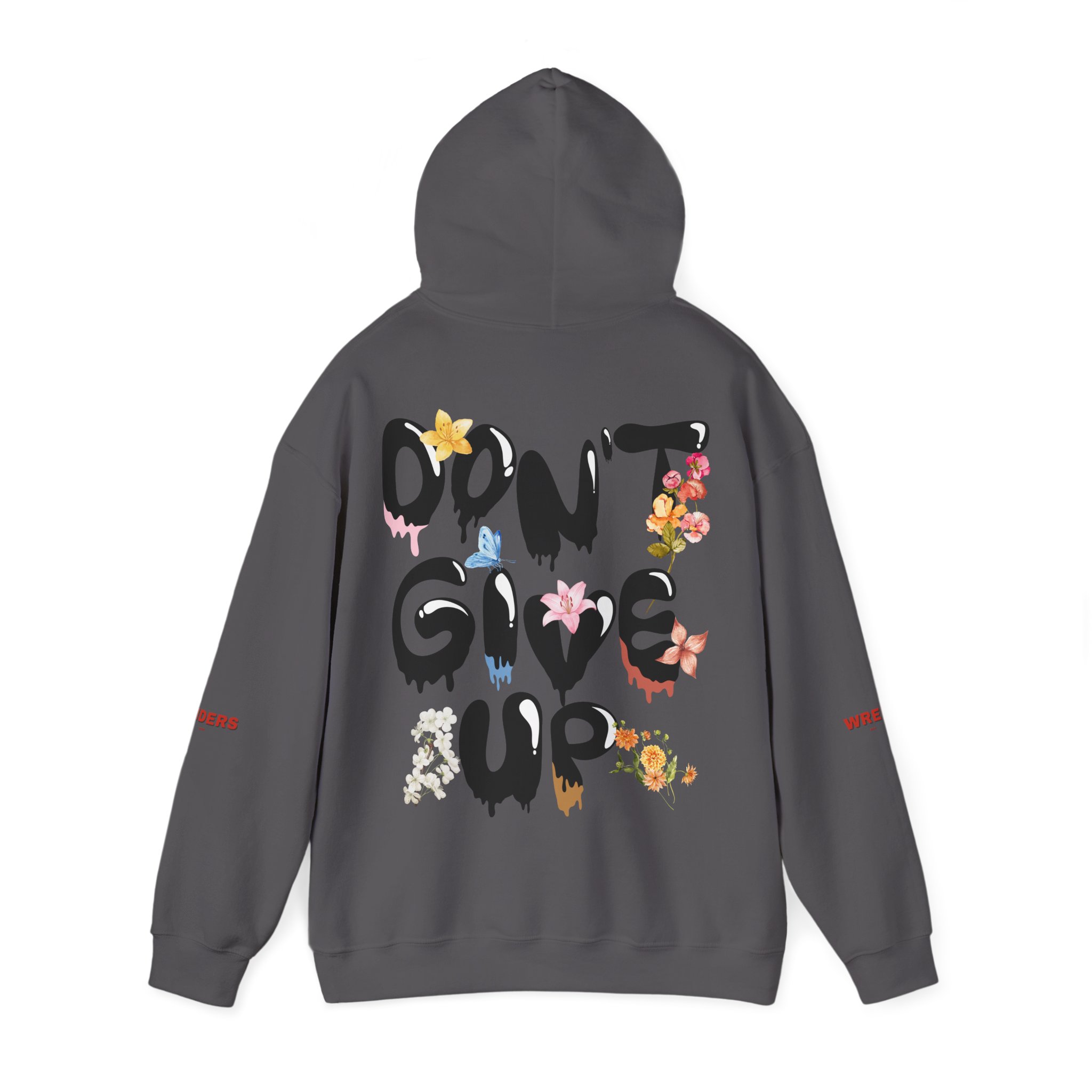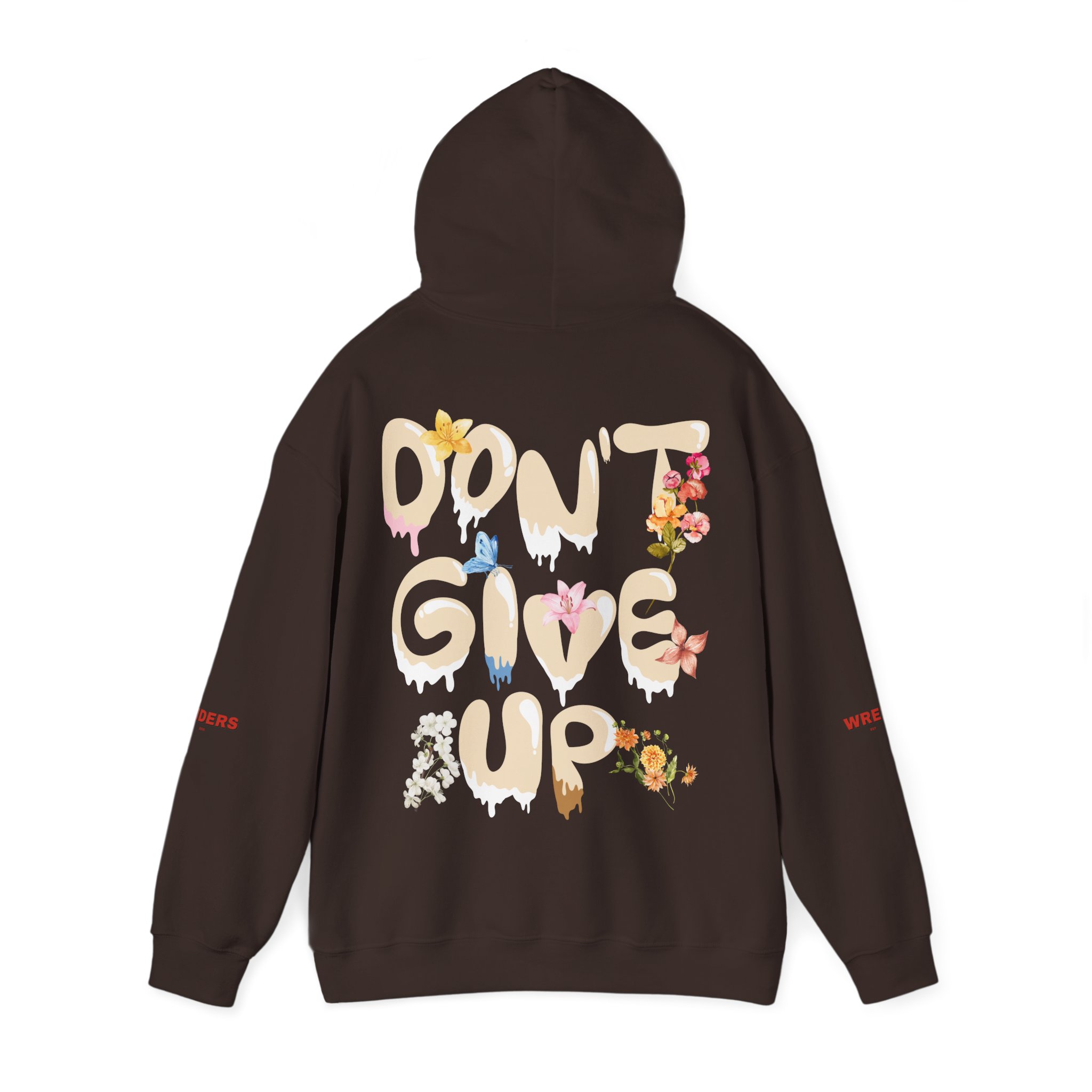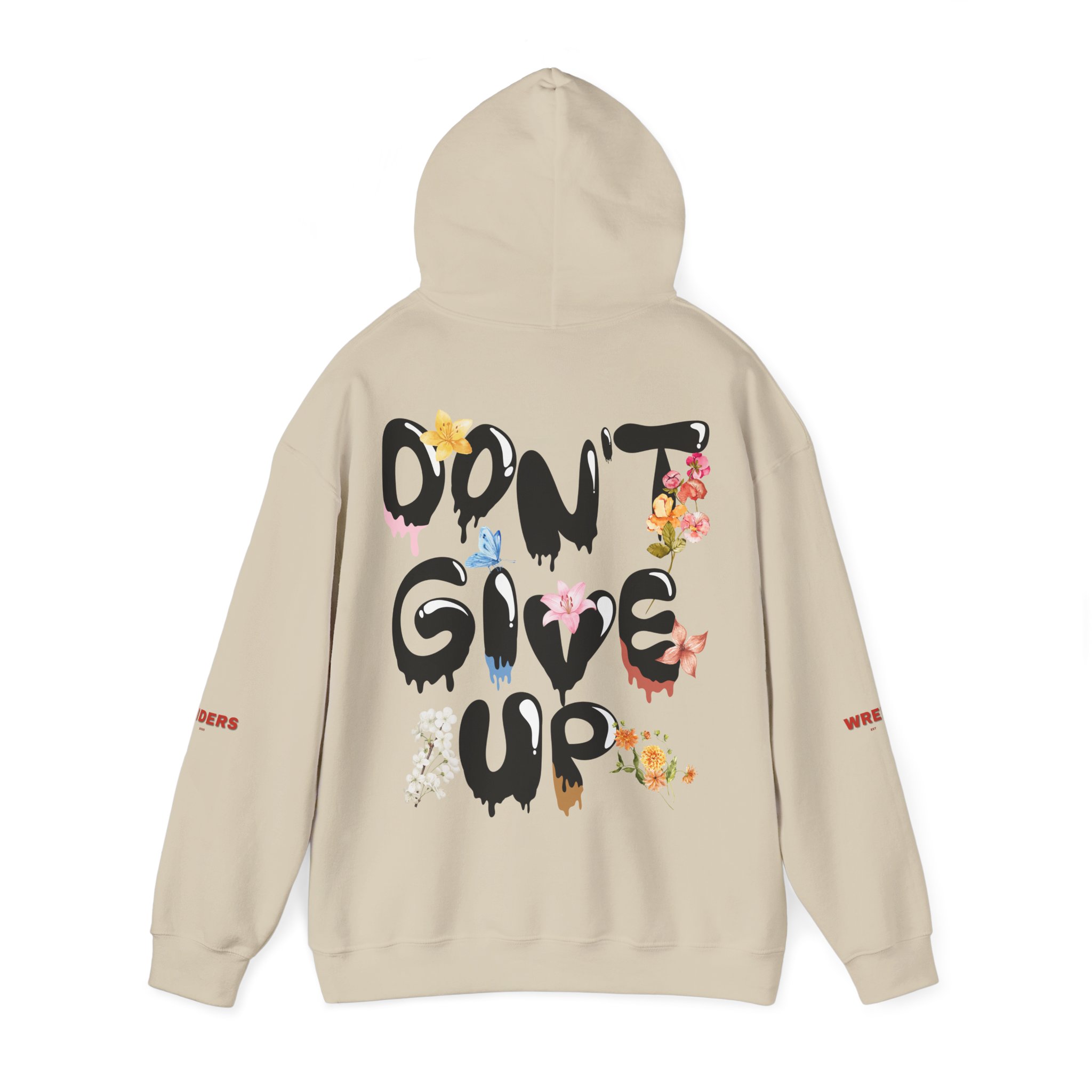 – Back artwork: bold drippy “DON’T GIVE UP” lettering with integrated floral illustration
