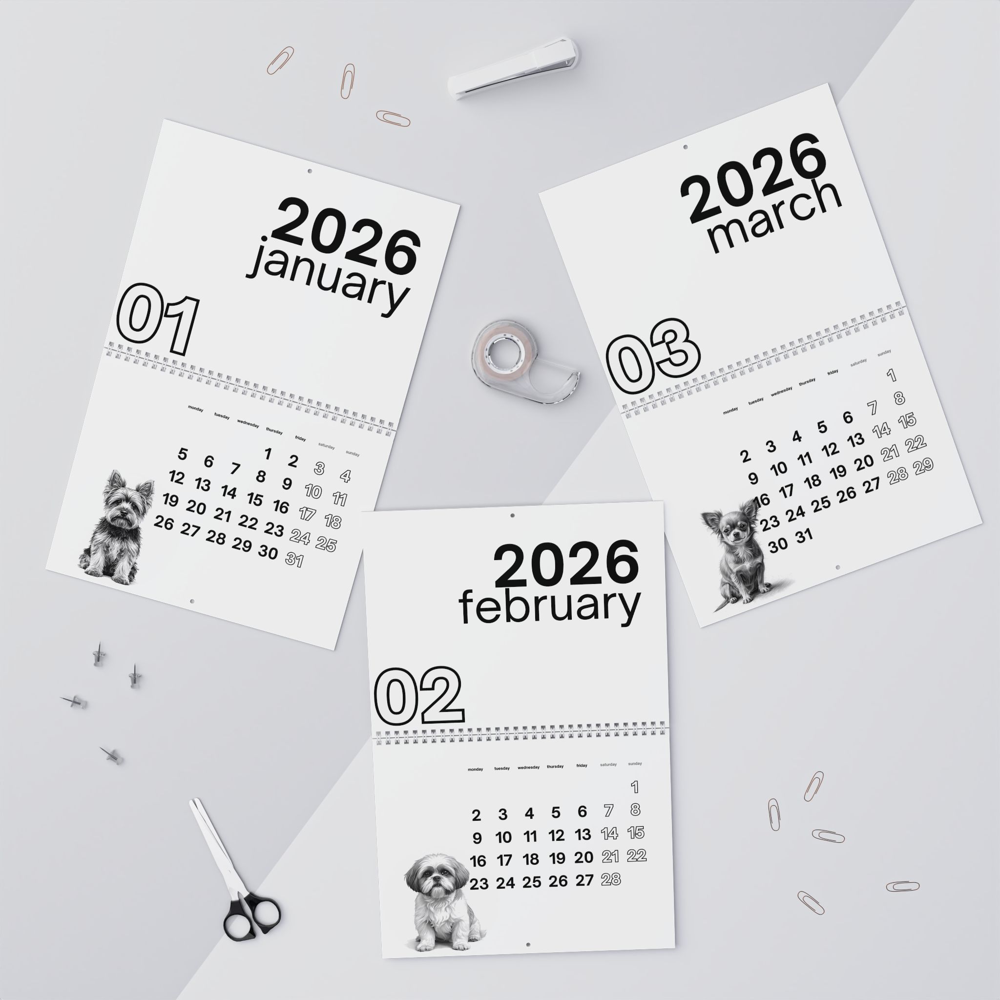 Bright, calm, and companionable, this illustrated dog wall calendar brings a year of gentle structure and warm moments to your wall. Each month opens to a large, gallery-style canine illustration that invites a slower breath before you plan the day. The month grid is matte and writable, so you can mark appointments, meal plans, or small joys with a pen or permanent marker without worrying about smears. Thick, premium paper and sturdy spiral binding give the calendar a substantial, tactile presence as you flip from month to month. A centred hanging hole keeps it steady above kitchen counters, work desks, or studio walls. Offered in two sizes, it fits both compact nooks and larger spaces, and arrives as a blank product so you can add your own date layout and personalize every month.