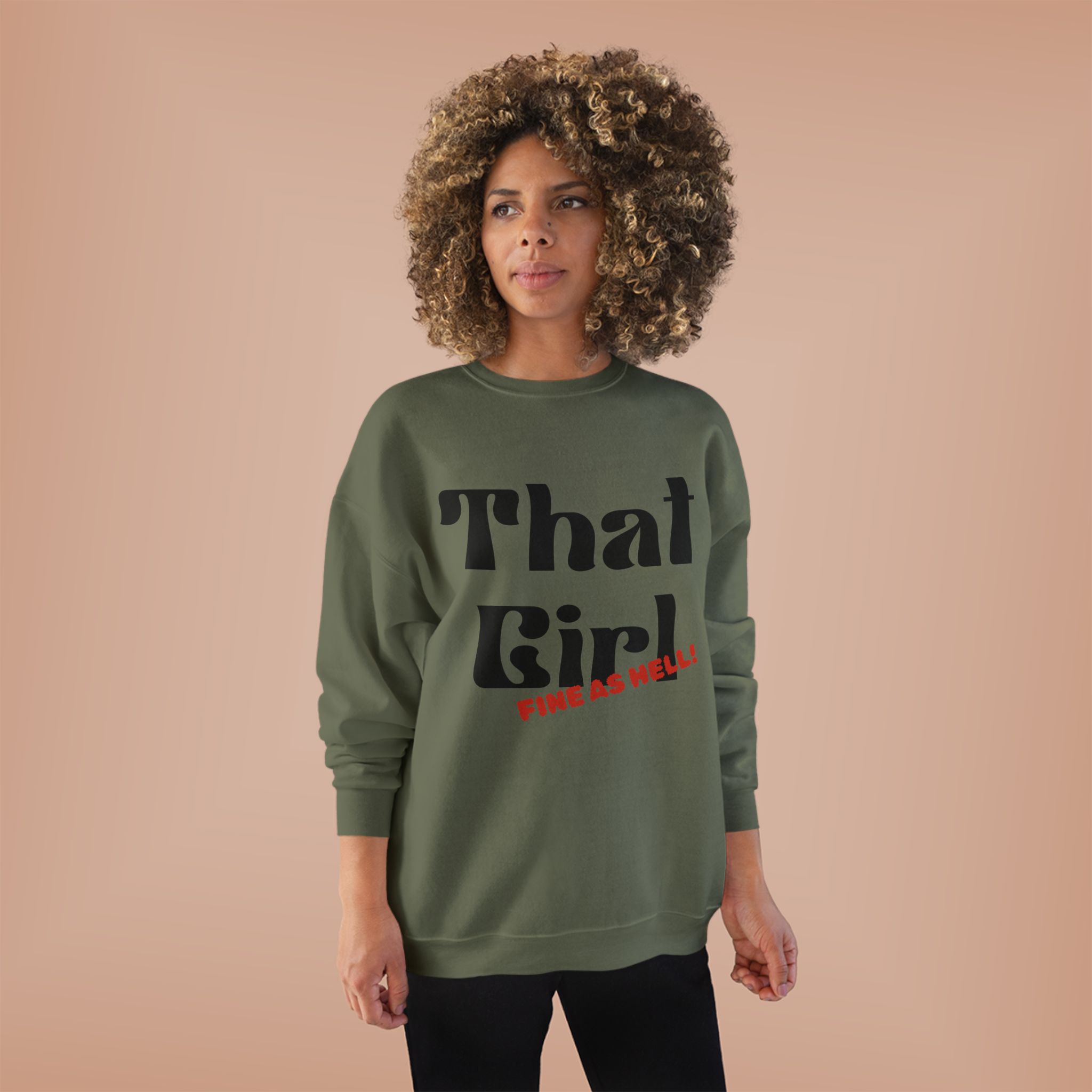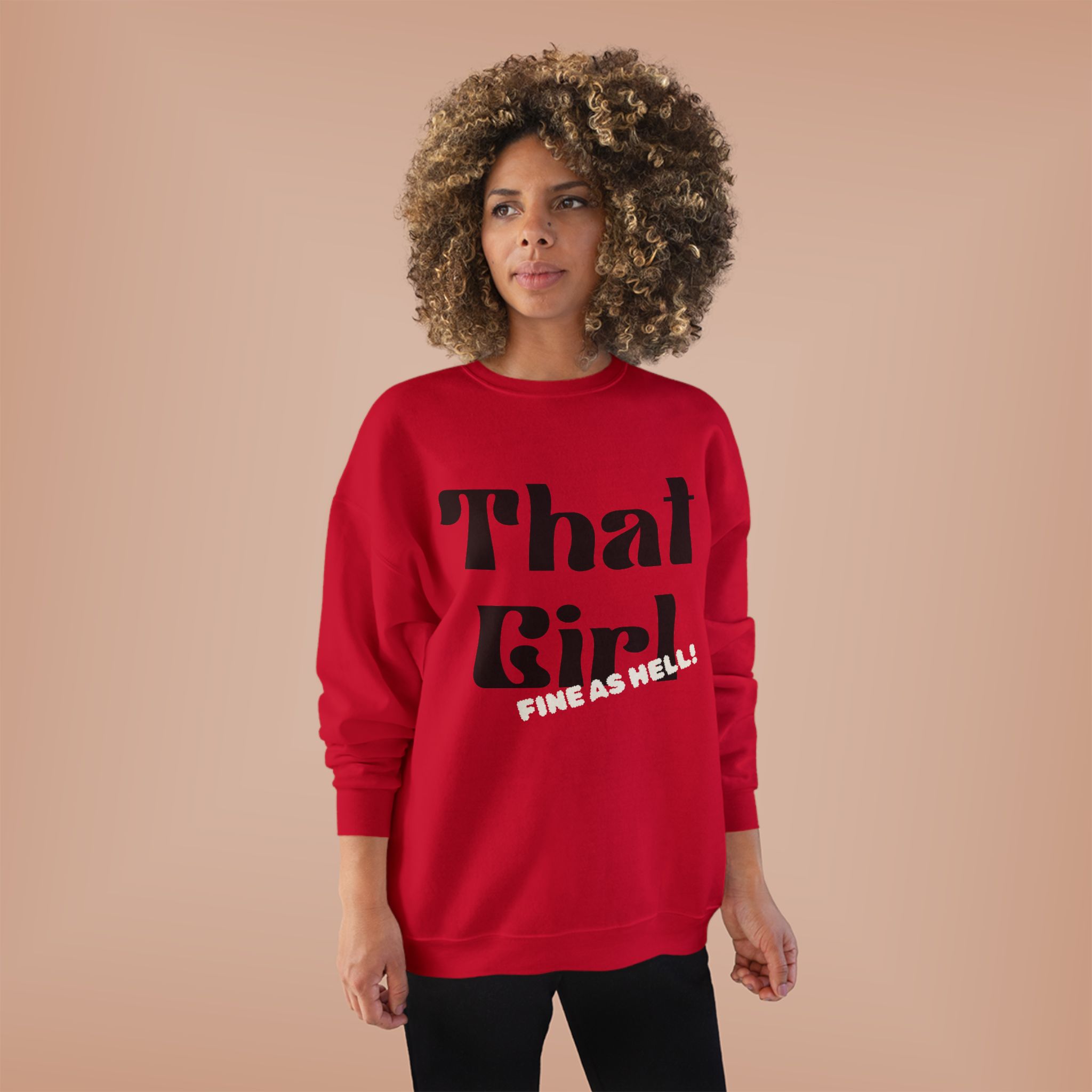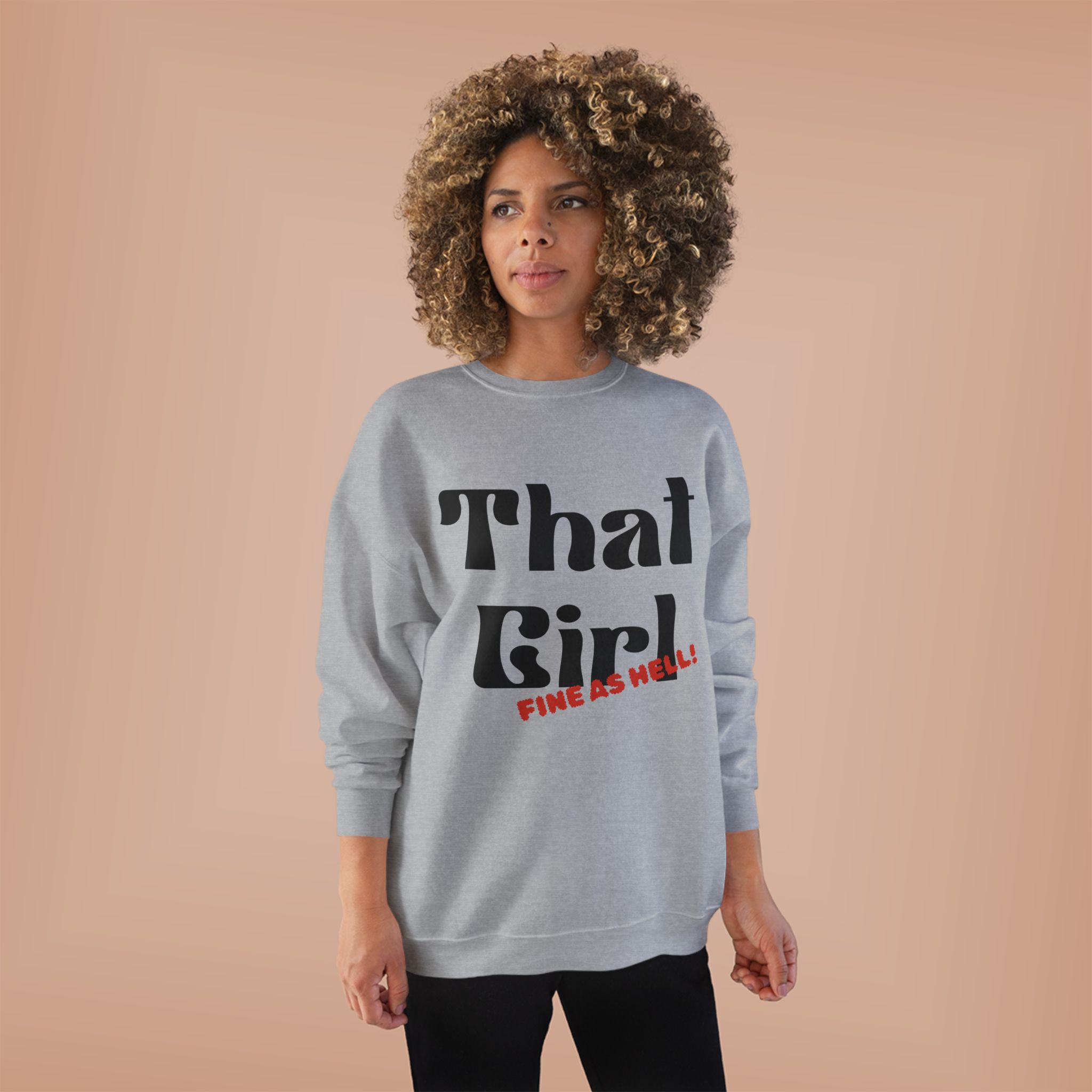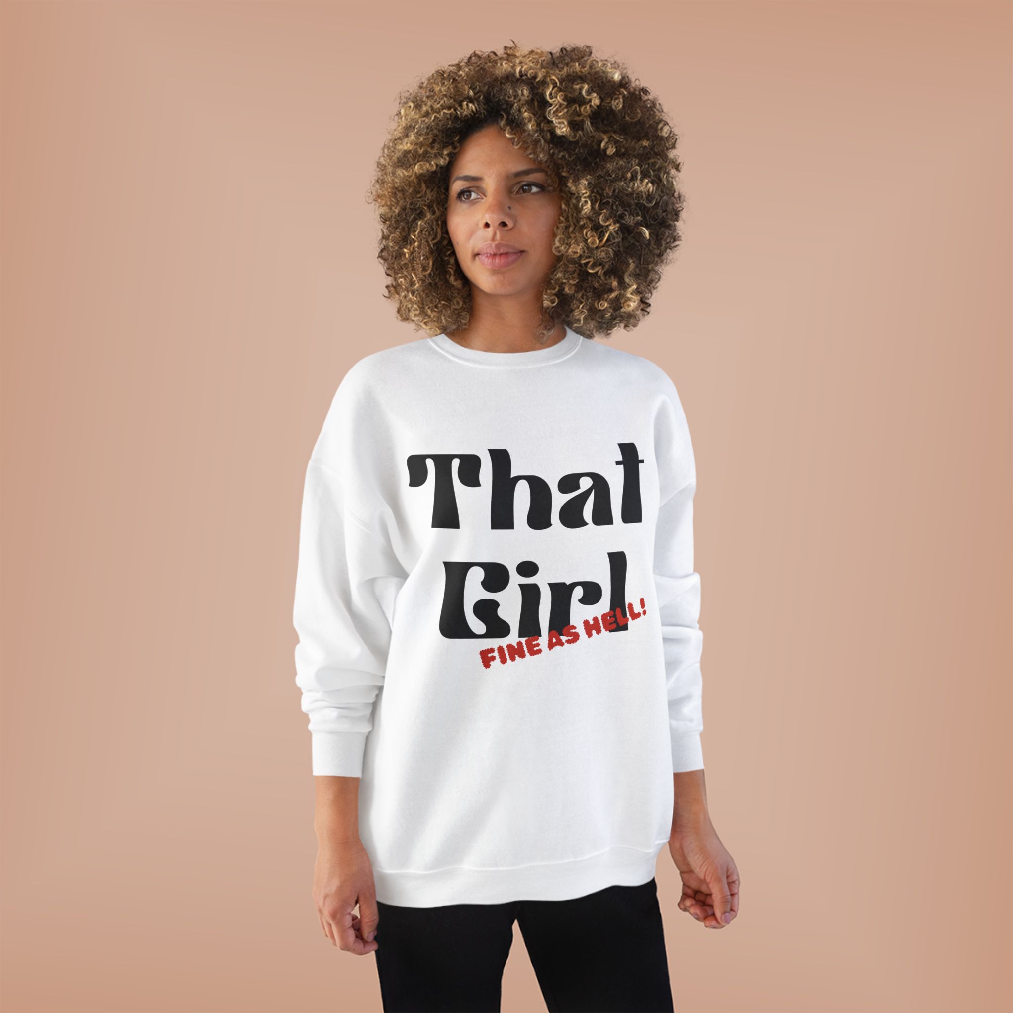 A soft, slightly oversized crewneck that reads like a bold note you’d leave for yourself. The warm fleece interior and medium-weight fabric cradle cool mornings while the clean white canvas makes the playful “THAT GIRL – FINE AS HELL!” message pop confident, cheeky, and effortlessly relaxed. Designed for easy layering, the tubular knit keeps the silhouette smooth and waste-conscious. Durable ribbed collar and double-needle cover-seams stand up to repeated wear, while the tag-free neck keeps things itch-free. A thoughtful mix of cotton and polyester (including a small amount of recycled fibre) balances cozy softness with lasting structure made to be worn loud and lived in.