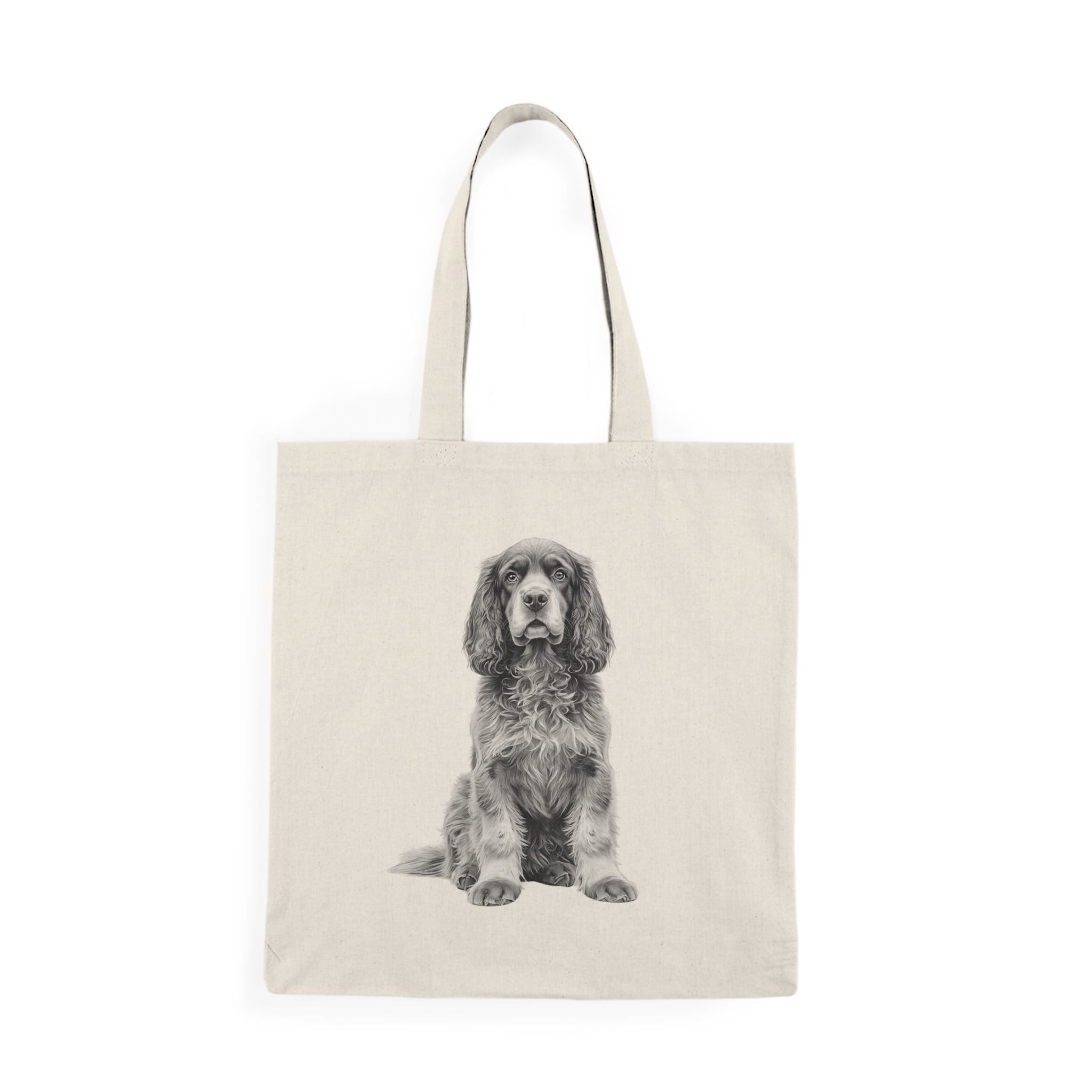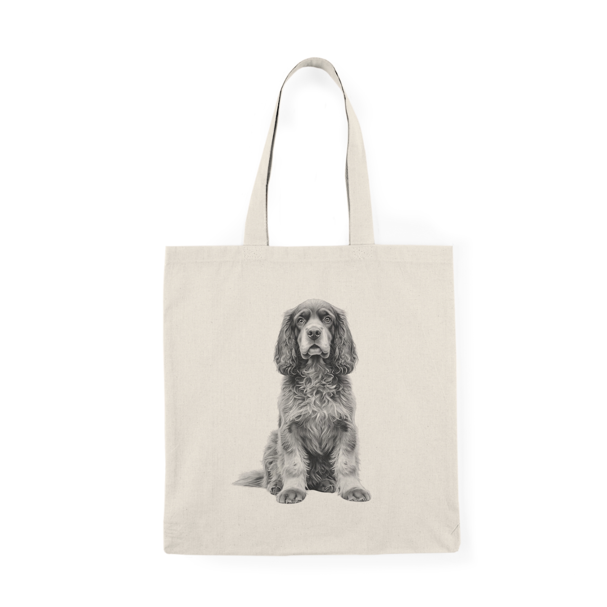 This natural cotton tote captures the quiet, soulful presence of a beloved spaniel printed in soft monochrome on both sides of a sturdy, eco-friendly canvas. Lightweight yet durable, it slips over your shoulder with self-fabric handles and carries daily essentials for market runs, library visits, or dog-walk afternoons. The detailed, high-contrast print keeps the portrait vivid while the neutral canvas blends easily with casual, outdoorsy wardrobes.