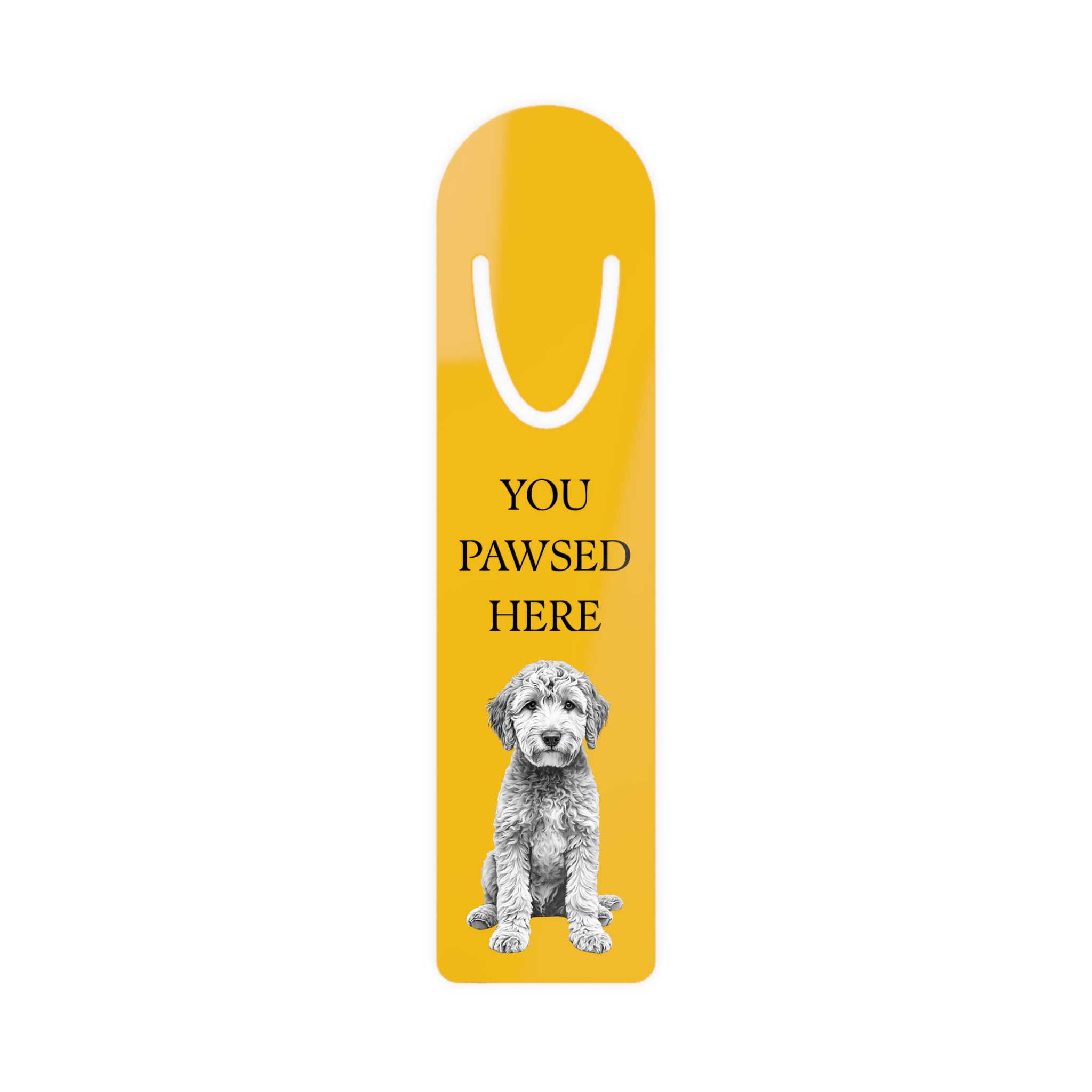Soft, quiet moments with a wagging tail beside you. This slender aluminum bookmark slips between pages without weight, its warm face bearing a playful Labradoodle and the cheeky line “You Pawsed Here.” Rounded ends make it pleasant to hold; a U-shaped slot at the top secures the page so your place won’t wander. The vivid, high-resolution print brings the pup to life against the muted background, while the sturdy aluminum back keeps the piece slim and durable. Whether you read on the couch, in a sunlit nook, or by a bedside lamp, this little marker adds a friendly nudge to pause, smile, and come back to the story.